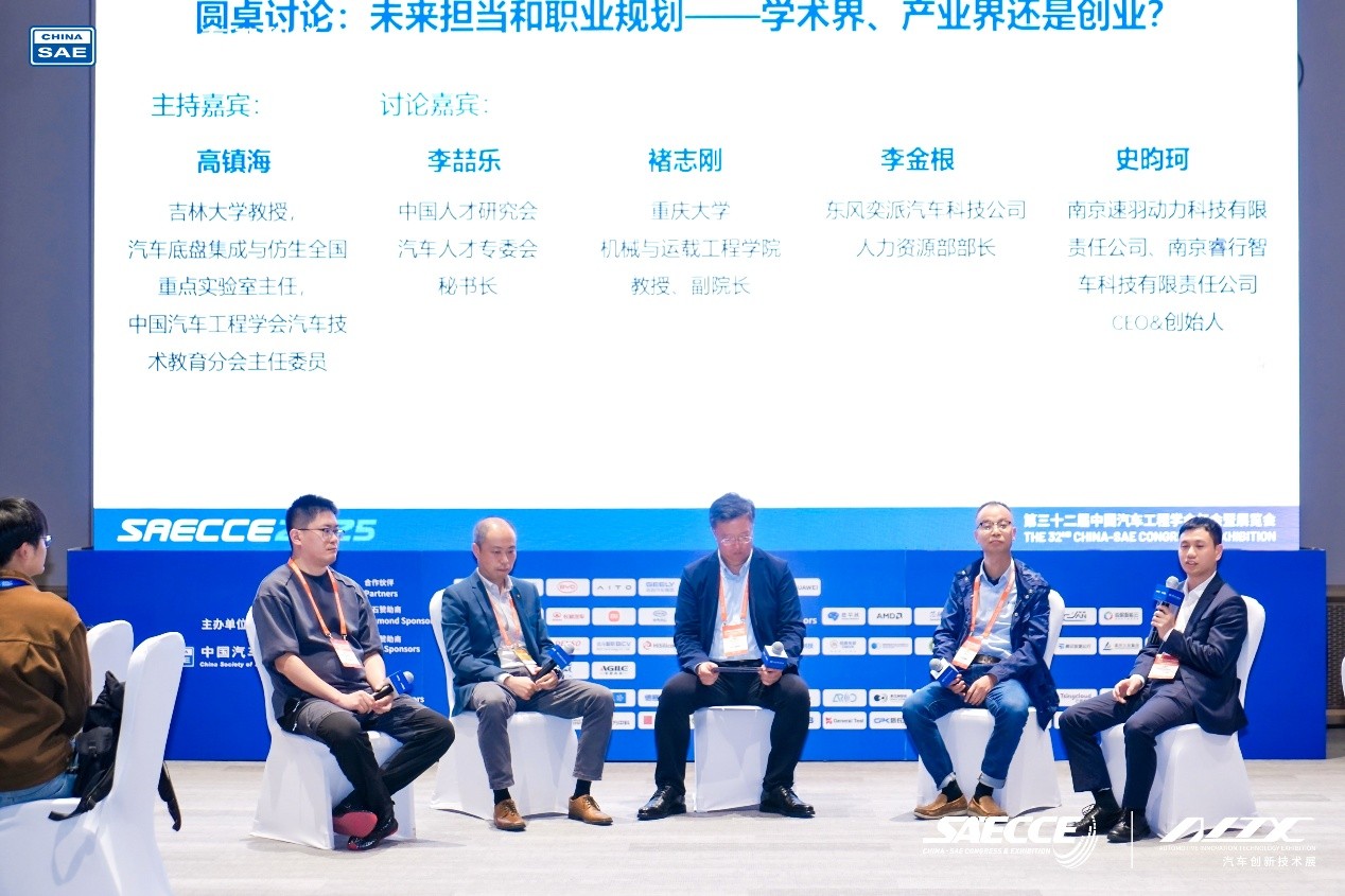 之后由汽车底盘集成与仿生全国重点实验室主任、中国汽车工程学会汽车技术教育分会主任委员、吉林大学教授高镇海,中国人才研究会汽车人才专委会秘书长李喆乐,重庆大学机械与运载工程学院副院长褚志刚,东风奕派汽车科技公司人力资源部部长李金根,南京速羽动力科技有限责任公司、南京睿行智车科技有限责任公司CEO&创始人史昀珂展开圆桌讨论,分别从学术界、产业界、创业界的角度分析发展变化、能力需求及成长轨迹。专家们结合自己的成长经历,阐明了不同选择的动机和影响,并鼓励年轻人根据自身特点勇敢探索,保持积极、乐观、坚定的心态,必将在汽车强国的时代下发挥出自己的才华。